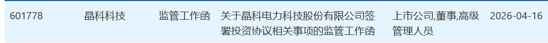 4月16日晚,上交所发布关于晶科科技签署投资协议相关事项的监管工作函,涉及对象为上市公司、董事、高级管理人员。