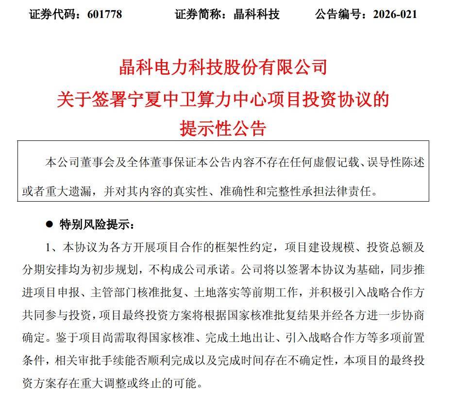16日盘后,晶科科技发布公告称,公司与中卫市政府签署投资协议,就宁夏中卫1GW算力中心项目达成合作意向,项目计划总投资约245亿元。合作不涉及关联交易,亦不构成重大资产重组。
